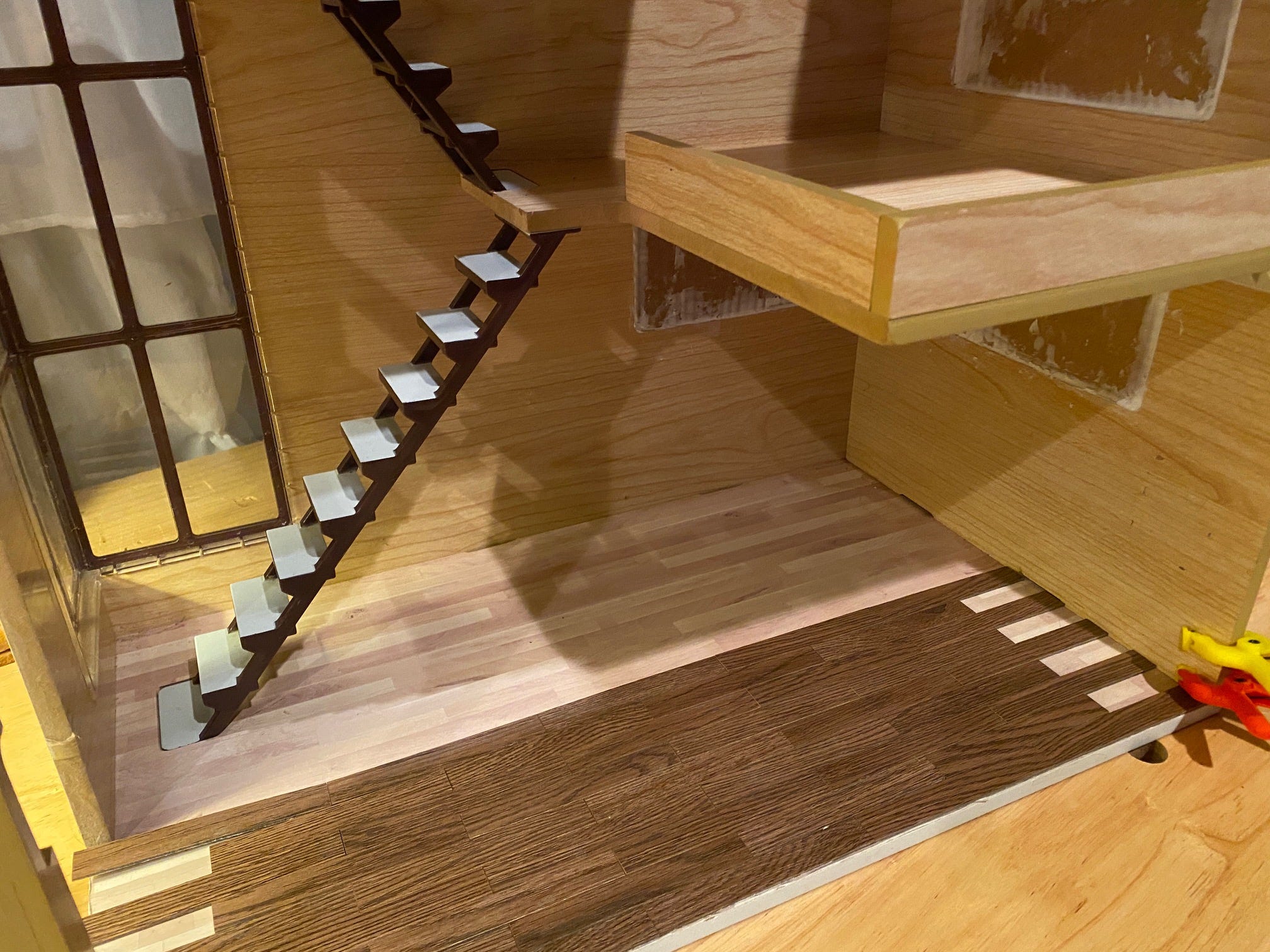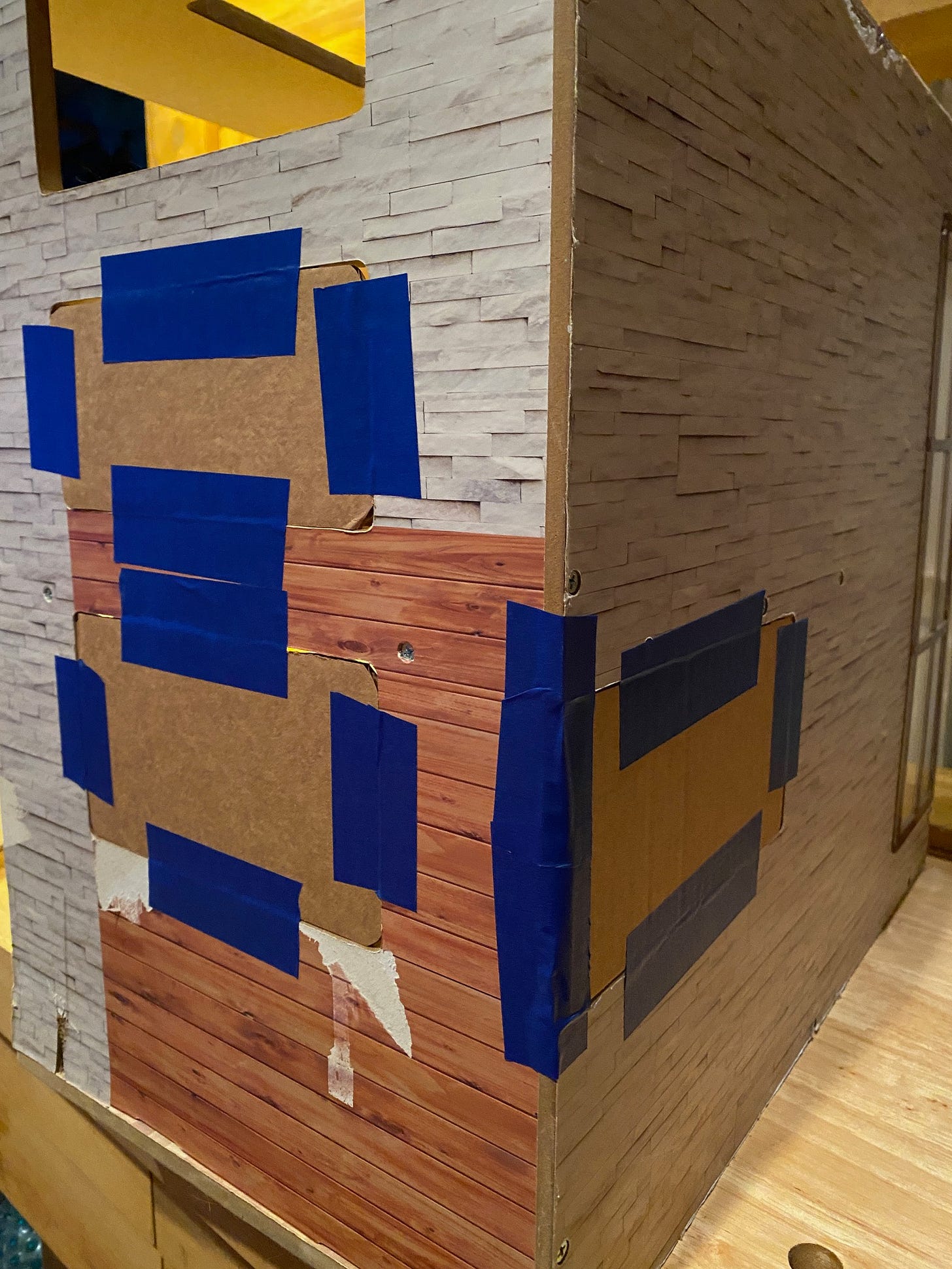 Next, I used painters tape and more cardboard to cover three of the windows, which were too low for future bookshelves. I sealed the interior edges with calking. This is my first time using calk, and so far it’s excellent! Many online miniaturists rave about it. It’s waterproof and strong.