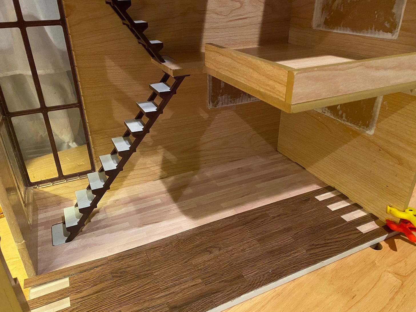 You may have noticed the dark floorboards. I usually make my own out of Popsicle sticks and tongue depressors but I wanted to try these miniature black walnut floor tiles. Expensive? Yes. Beautiful? Absolutely! This was merely a no-stick run to see how many I needed to order. (I’ve estimated four packs of 40 = 160 pieces.)